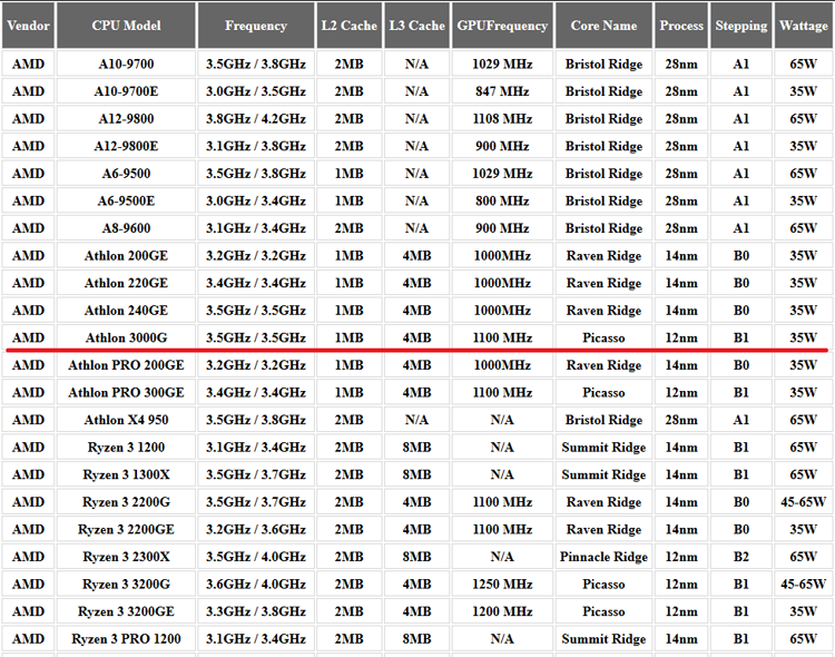 Стоит заметить, что судя по опубликованным характеристикам, Athlon 3000G окажется аналогом Athlon 240GE, выпущенным по более «тонкому» техпроцессу, и, вероятно, имеющим немного более быстрое встроенное графическое ядро за счёт увеличения его частоты с 1,0 до 1,1 ГГц.