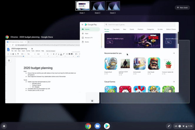 - Добавлена поддержка виртуальных рабочих столов. Пользователь теперь может создать до четырёх виртуальных рабочих столов, произвольно переносить приложения между ними и переключаться на любой из них. Для создания виртуального рабочего стола в режиме с обзором запущенных приложений в верхнем правом углу добавлена кнопка "New Desk";