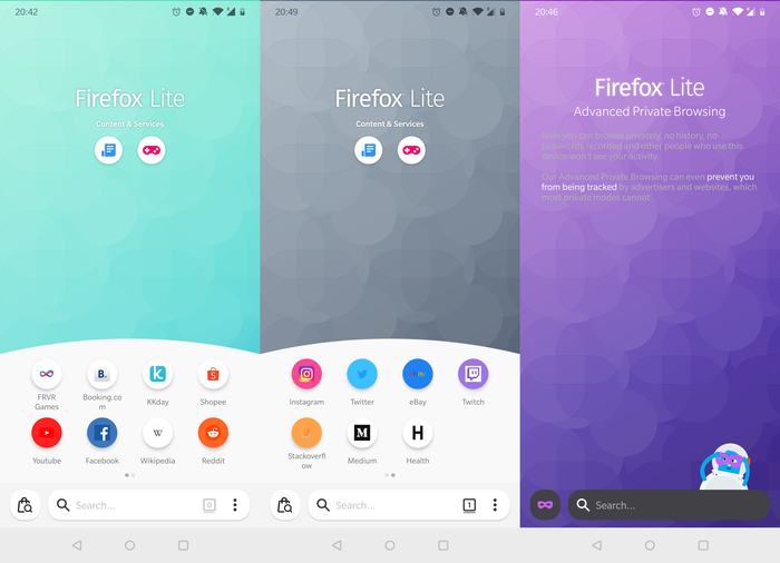Firefox Lite поддерживает такие возможности как закладки на избранные сайты, просмотр истории посещений, вкладки для одновременной работы с несколькими страницами, менеджер загрузок, быстрый поиск текста на страницах, режим приватного просмотра (не сохраняются Cookie, история и данные в кеше). Среди расширенных возможностей: