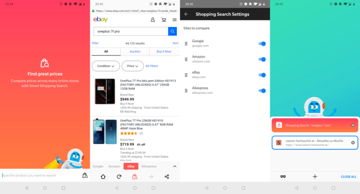 В нижнюю часть стартовой страницы, рядом со строкой поиска появилась кнопка "шопинг", при нажатии которой выводится специализированный интерфейс для поиска товаров и сравнения цен в разных интернет-магазинах, без захода на их сайты. Поддерживается поиск товаров в Google, Amazon, eBay и Aliexpress. Возможно получение купонов на скидки непосредственно через браузер, но данная возможность пока ограничена только для пользователей из Индии и Индонезии.