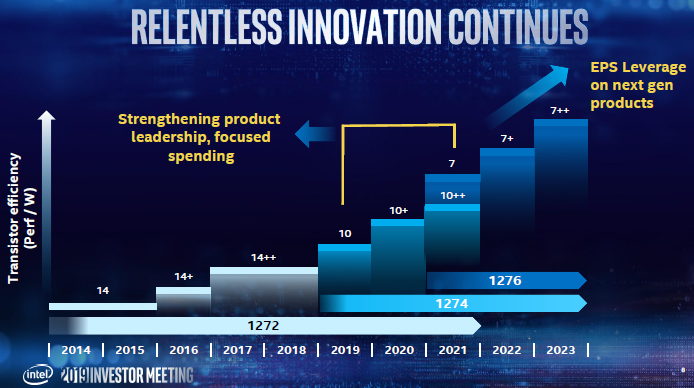 Затянув переход на 10-нм техпроцесс на четыре с половиной года, руководство Intel решило исключить подобные проколы в будущем, а потому обещает переходить на новый техпроцесс за два с половиной года. Это относится как к 7-нм, так и к 5-нм техпроцессу. Первый 7-нм продукт Intel будет представлен в конце 2021 года. Значит, выхода первого 5-нм продукта придётся ждать до 2024 года. Что это будет за продукт, не уточняется.