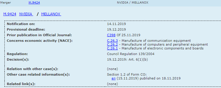 На этой неделе истёк срок рассмотрения сделки между NVIDIA и Mellanox европейскими регуляторами, и вчера агентство Reuters сообщило, что предстоящее поглощение было одобрено без каких-либо дополнительных условий. Напомним, что NVIDIA должна купить израильского разработчика скоростных интерфейсов Mellanox Technologies за сумму более $6,8 млрд, которую возьмёт из собственных средств. Дело остаётся за малым — получить разрешение антимонопольных органов Китая, где у Mellanox находятся крупные клиенты типа Alibaba и Baidu.