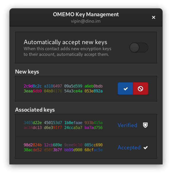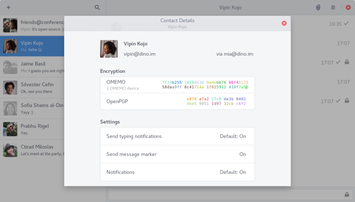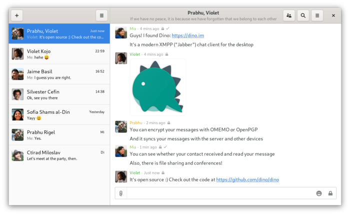 Dino, поддерживающего участие в чатах и обмен сообщениями с использованием протокола Jabber/XMPP. Программа совместима с различными клиентами и серверами XMPP, ориентирована на обеспечение конфиденциальности переговоров и поддерживает сквозное шифрование с применением XMPP-расширения