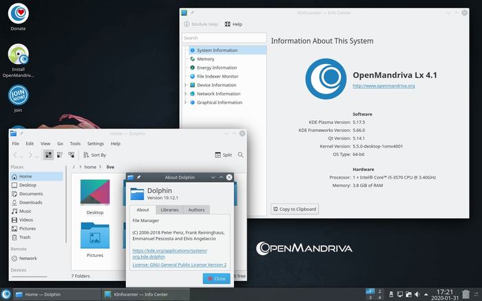 - Задействованы новые версии ядра Linux 5.5, Glibc 2.30, systemd 244, Java 13, Qt 5.14.1, KDE Frameworks 5.66, KDE Plasma 5.17.5, KDE Applications 19.12.1, LibreOffice 6.4.0, Falkon 3.1.0, Krita 4.2.8, Kdenlive 19.12.1, SMPlayer 19.10.2, DigiKam 7.0.0;
