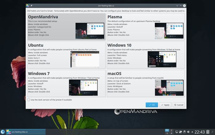 - Добавлен конфигуратор Desktop Presets (om-feeling-like), предлагающий набор преднастроек, позволяющих придать рабочему столу KDE Plasma внешний вид других окружений (например, сделать похожим на интерфейс Ubuntu, Windows 7, Windows 10, macOS и т.п.);