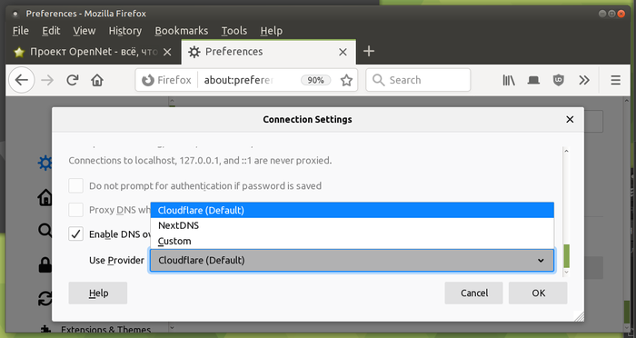 - Режим DNS поверх HTTPS (DoH, DNS over HTTPS) включён по умолчанию для пользователей из США. В качестве DNS-провайдера по умолчанию предлагается CloudFlare (mozilla.cloudflare-dns.com занесён в списки блокировки Роскомнадзора), а в качестве опции доступен NextDNS. Изменить провайдера или включить DoH в странах, отличных от США, можно в настройках сетевого соединения. Подробнее о DoH в Firefox можно прочитать в отдельном анонсе.