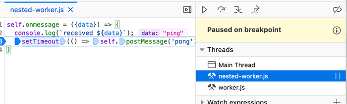 - В отладчик JavaScript добавлена возможность отладки вложенных Web Worker-ов, выполнение которых может быть приостановлено и пошагово отлажено с применением точек останова.
