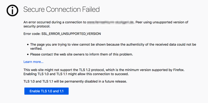 - Отключена поддержка протоколов TLS 1.0 и TLS 1.1. Для обращения к сайтам по защищённому каналу связи сервер должен предоставить поддержку как минимум TLS 1.2. По данным Google в настоящее время около 0.5% загрузок web-страниц продолжает осуществляться с использованием устаревших версий TLS. Отключение произведено в соответствии с рекомендациями IETF (Internet Engineering Task Force). Причиной отказа от поддержки TLS 1.0/1.1 является отсутствие поддержки современных шифров (например ECDHE и AEAD) и требование поддержки старых шифров, надёжность которых на современном этапе развития вычислительной техники поставлена под сомнение (например, требуется поддержка TLS_DHE_DSS_WITH_3DES_EDE_CBC_SHA, для проверки целостности и аутентификации используется MD5 и SHA-1). При попытке использования TLS 1.0 и TLS 1.1 начиная с Firefox 74 будет выводиться ошибка. Вернуть возможность работы с устаревшими версиями TLS можно через настройку security.tls.version.enable-deprecated = true или при помощи кнопки на странице с ошибкой, выводимой при заходе на сайт со старым протоколом.