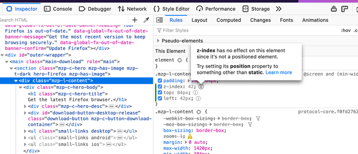 - В интерфейсе для инспектирования web-страниц обеспечено отображение предупреждений для CSS-свойств, зависящих от позиционируемых элементов z-index, top, left, bottom и right.