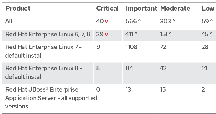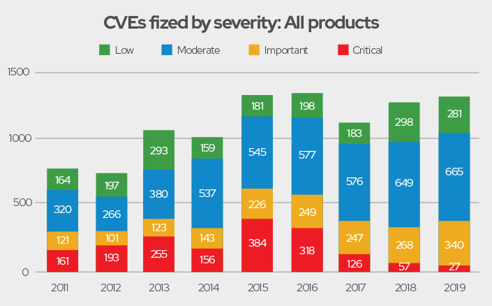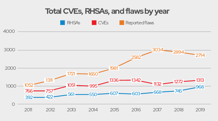 Компания Red Hat опубликовала отчёт с анализом рисков, связанных оперативностью устранения уязвимостей, выявленных в продуктах Red Hat в течение 2019 года. За год в продуктах и сервисах Red Hat было исправлено 1313 уязвимостей (на 3.2% больше, чем за 2018 год), из которых 27 был присвоен статус критических проблем. Всего службой безопасности Red Hat в 2019 году было изучено 2714 уязвимостей, охватывающих все возможные проблемы, в том числе в открытых программах, не входящих в состав RHEL или не проявляющиеся в RHEL.