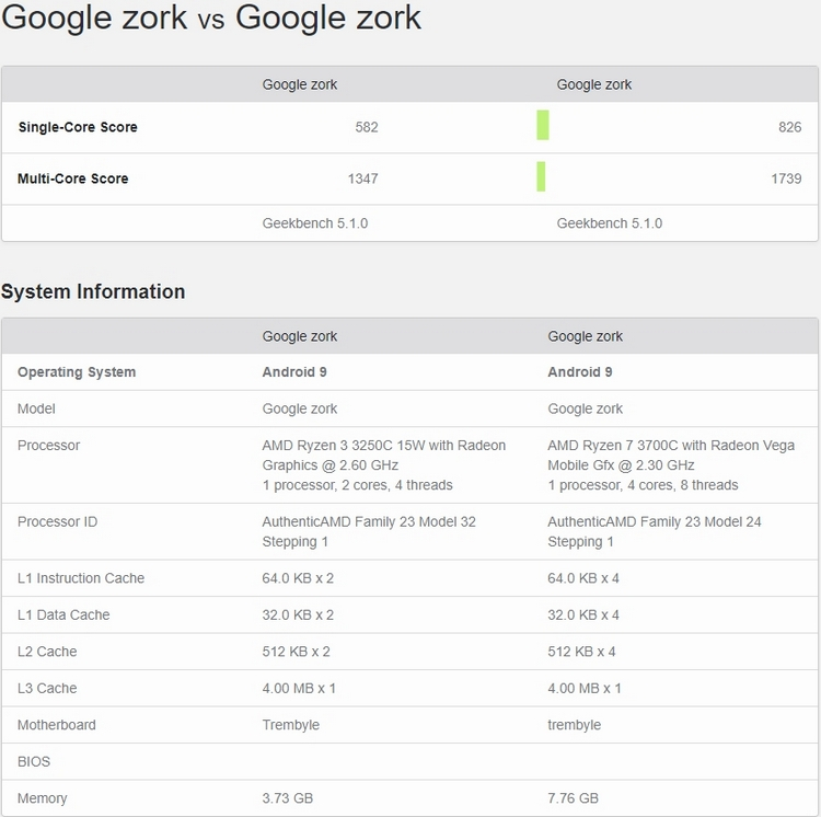 В некоторых тестах в качестве основы Google Zork выступает процессор Ryzen 3 3250C. Он обладает двумя ядрами и четырьмя потоками и работает с базовой частотой 2,6 ГГц. Имеется у данного чипа и некая встроенная графика Radeon, но её характеристики неизвестны. Компанию чипу в тестах составили 4 Гбайт оперативной памяти.