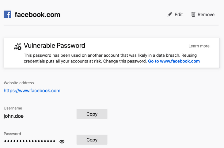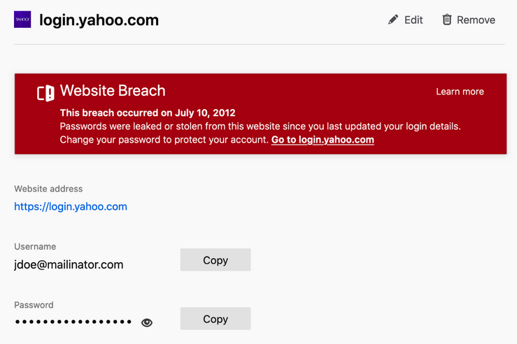 Также добавлен вывод предупреждения о компрометации паролей, используемых на нескольких сайтах. Если один из сохранённых аккаунтов фигурирует в утечке учётных данных и пользователь повторно использует тот же самый пароль на других сайтах, то ему будет рекомендовано поменять пароль. Проверка осуществляется через интеграцию с базой данных проекта haveibeenpwned.com, включающей сведения о 9.5 миллиардах учётных записей, похищенных в результате взломов 443 сайтов. Метод проверки является анонимным и основан на передаче префикса SHA-1 хэша от email (несколько первых символов), в ответ на который сервер выдаёт соответствующие запросу хвосты хэшей из своей базы, а браузер на своей стороне сверяет их с имеющимся полным хэшем и в случае совпадения выдаёт предупреждение (полный хэш не передаётся).