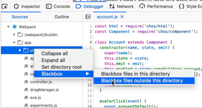 - В отладчике JavaScript добавлена возможность игнорирования файлов, которые не задействованы при отладке. Через контекстное меню "blackbox" предложены опции для скрытия в боковой панели содержимого, размещённого в выбранном каталоге или вне его. При копировании трассировок стека обеспечено помещение в буфер обмена полного пути, а не только имени файла.