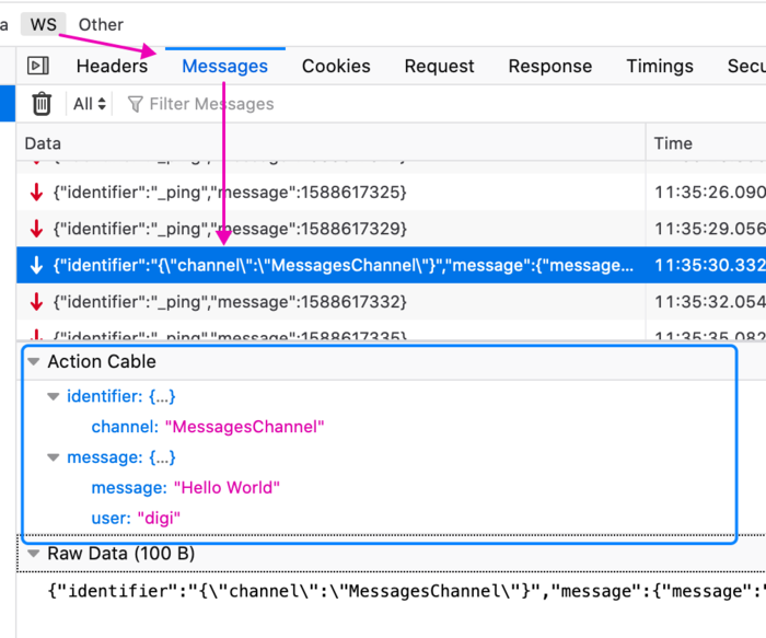 - В интерфейс инспектирования WebSocket добавлен новый фильтр Control для показа управляющих кадров. Реализована возможность предпросмотра сообщений в формате ActionCable, который добавлен в список автоматически форматируемых протоколов по аналогии с socket.io, SignalR и WAMP.