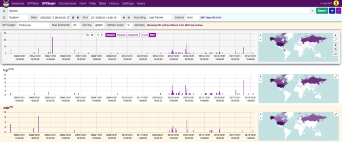 В web-интерфейсе предусмотрено несколько режимов просмотра - от общей статистики, карты соединений и наглядных графиков с данными об изменении сетевой активности до инструментов для изучения отдельных сеансов, анализа активности в разрезе используемых протоколов и разбора данных из PCAP-дампов.