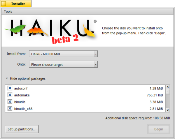 - В инсталлятор добавлена возможность исключения при установке необязательных пакетов, присутствующих на носителе. При настройке дисковых разделов показано больше информации о накопителях, реализовано определение применения шифрования и добавлены сведения о свободном пространстве в существующих разделах. Доступна опция для быстрого обновления Haiku R1 Beta 1 до выпуска Beta 2.