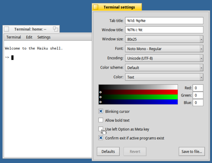 - В терминале обеспечена эмуляция клавиши Meta. В настройках можно назначить выполнение роли Meta клавише Alt/Option, находящейся слева от пробела (клавиша Alt справа от пробела сохранит своё назначение).
