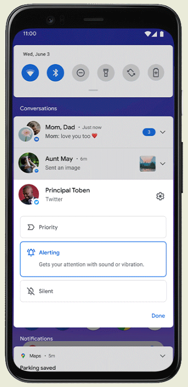 - Внесены изменения, нацеленные на упрощение общения людей при помощи смартфона. В выпадающей сверху области с уведомлениями реализована сводная секция сообщений, позволяющая в одном месте просматривать и отвечать на сообщения из всех приложений (сообщения показываются без разделения на отдельные приложения). Важным чатам можно назначать статус приоритетных, чтобы они находились на видном месте и показывались даже в режиме "не беспокоить".