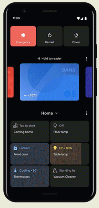 Предложен интерфейс для быстрого доступа к инструментам управления прикреплёнными устройствами, такими как системы управления умным домом, который вызывается длительным удержанием кнопки включения питания. Например, теперь можно не запуская отдельных программ быстро откорректировать параметры домашнего термостата, включить освещение и разблокировать двери. В интерфейсе также предложены кнопки для быстрого выбора привязанных платёжных систем и электронных посадочных талонов.