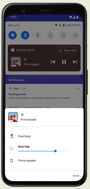 Добавлены новые элементы управления воспроизведением мультимедийного контента, позволяющие просто и быстро менять устройство, через которое осуществляется воспроизведение видео или звука. Например, можно быстро переключить воспроизведение музыки с наушников на телевизор или внешние колонки.
