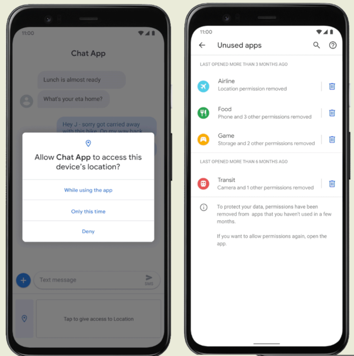 - Добавлена поддержка предоставления одноразовых полномочий, позволяющих дать возможность приложению выполнить привилегированную операцию один раз и при следующей попытке доступа запросить подтверждение вновь. Например, можно настроить вывод запроса полномочий при каждом обращении к микрофону, камере или API определения местоположения.