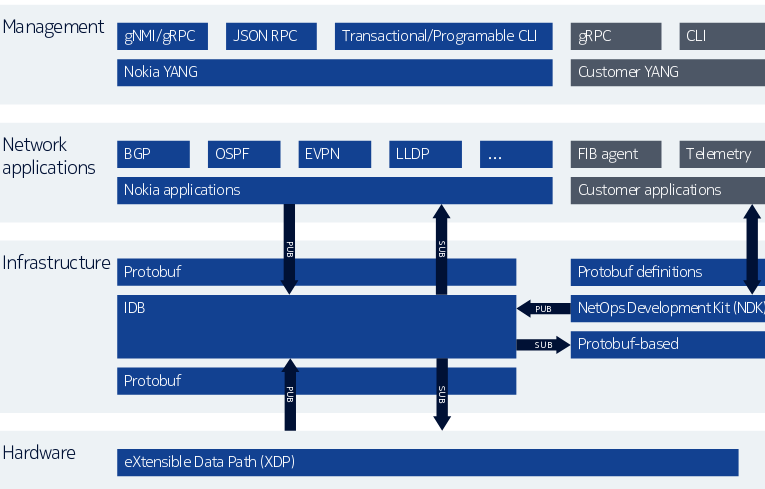 Реализации сетевых протоколов, включая Multiprotocol Border Gateway Protocol (MP-BGP), Ethernet VPN (EVPN) и Virtual Extensible LAN (VXLAN), основаны на проверенном стеке протоколов SR OS (Nokia Service Router Operating System), уже применяемом на более чем миллионе маршрутизаторов Nokia. Для абстрагирования от аппаратных компонентов используется прослойка Nokia XDP (eXtensible Data Path).