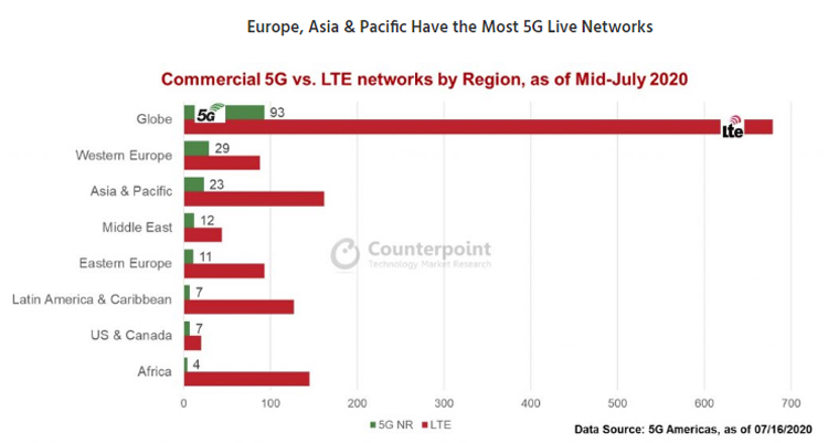 Отмечается, что больше всего 5G-сетей запущено в эксплуатацию в Западной Европе — 29. На втором месте с 23 действующими сетями находится Азиатско-Тихоокеанский регион. Ещё 12 сетей работают на Ближнем Востоке, 11 сетей — в Восточной Европе.