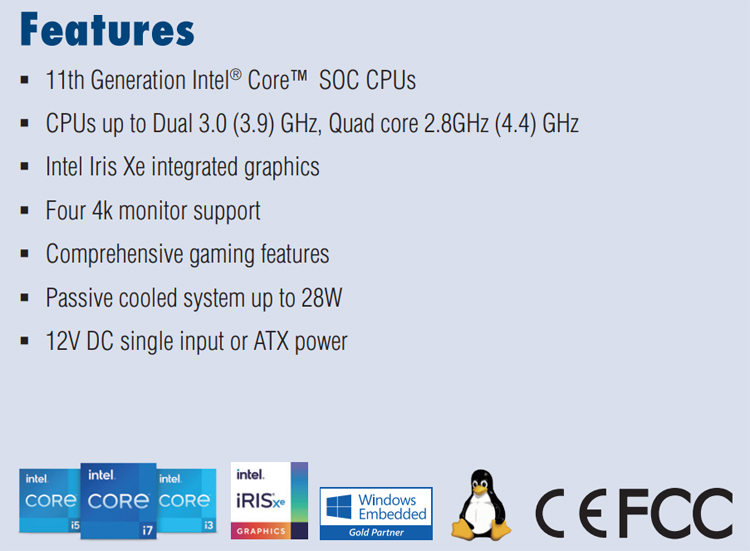 Изделие может быть оснащено чипом Core одиннадцатого поколения (Tiger Lake) с двумя (до 3,9 ГГц) или четырьмя (до 4,4 ГГц) вычислительными ядрами и встроенной графикой Intel Iris Xe. Реализовано пассивное охлаждение на основе крупногабаритного радиатора.