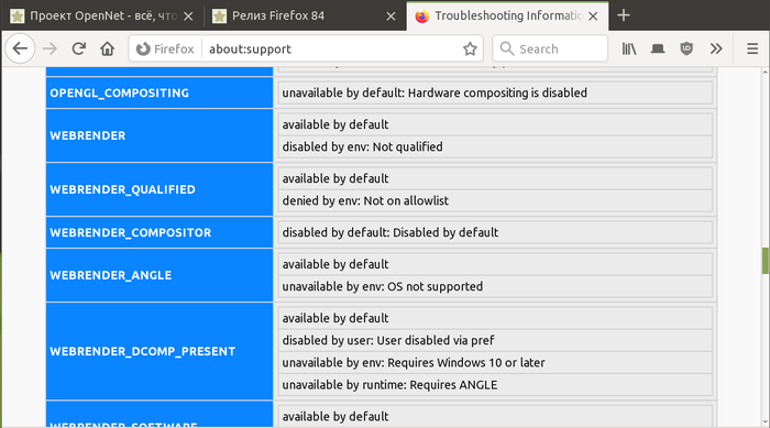 - На платформе Linux для GNOME и X11 по умолчанию задействован движок композитинга WebRender, написанный на языке Rust и позволяющий добиться существенного увеличения скорости отрисовки и снижения нагрузки на CPU за счёт выноса на сторону GPU операций отрисовки содержимого страницы, которые реализованы через выполняемые в GPU шейдеры. В списке блокировки для WebRender остаются проприетарные драйверы NVIDIA, а также драйверы Intel при использовании экранных разрешений 3440x1440 и выше. Для принудительного включения в about:config следует активировать настройку "gfx.webrender.enabled" или запустить Firefox с выставленной переменной окружения MOZ_WEBRENDER=1.