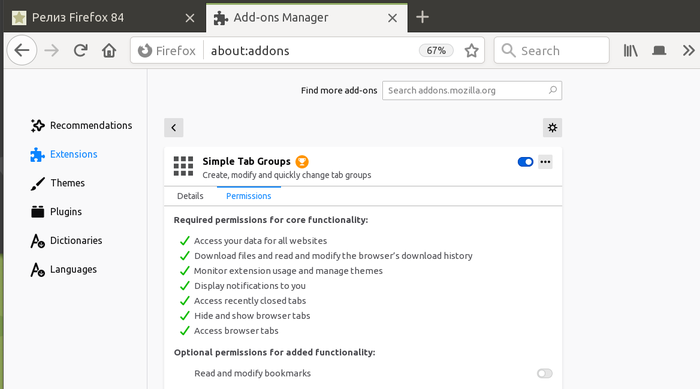 - В менеджере дополнений (about:addons) реализована возможность предоставления и отзыва необязательных дополнительных прав, необходимых для реализации в дополнении расширенной функциональности, включаемой через отдельные настройки. Ранее подобные расширенные права запрашивались динамически при включении расширенных функций и не отражались в интерфейсе about:addons. Например, дополнение Simple Tab Groups имеет дополнительную функцию создания закладок, которая по умолчанию отключена, а при включении требует полномочий для доступа к закладкам.
