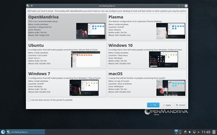 - Обновлён конфигуратор Desktop Presets (om-feeling-like), предлагающий набор преднастроек, позволяющих придать рабочему столу KDE Plasma внешний вид других окружений (например, сделать похожим на интерфейс Ubuntu, Windows 7, Windows 10, macOS и т.п.);