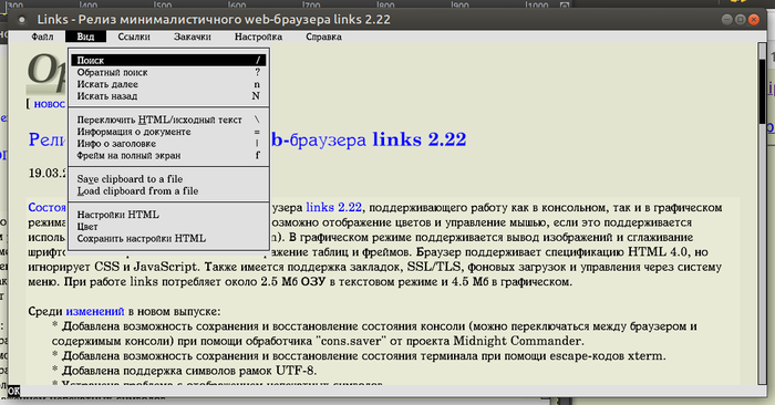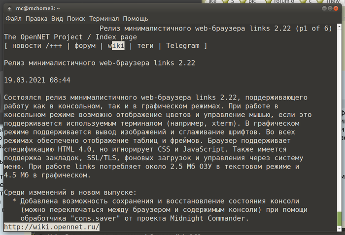links 2.22, поддерживающего работу как в консольном, так и в графическом режимах. При работе в консольном режиме возможно отображение цветов и управление мышью, если это поддерживается используемым терминалом (например, xterm). В графическом режиме поддерживается вывод изображений и сглаживание шрифтов. Во всех режимах обеспечено отображение таблиц и фреймов. Браузер поддерживает спецификацию HTML 4.0, но игнорирует CSS и JavaScript. Также имеется поддержка закладок, SSL/TLS, фоновых загрузок и управления через систему меню. При работе links потребляет около 2.5 Мб ОЗУ в текстовом режиме и 4.5 Мб в графическом.