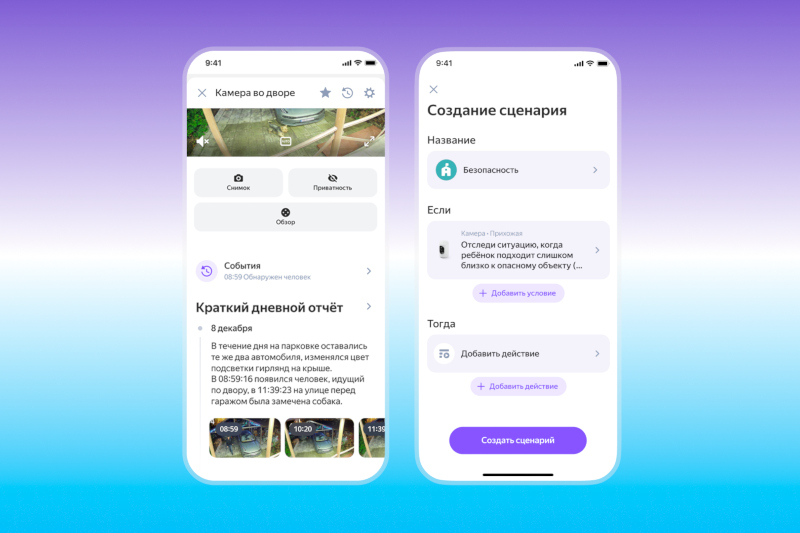 Пользователь также может своими словами формулировать условия для сценария умного дома — достаточно в свободной форме описать ситуацию, например «собака грызёт диван», и выбрать, что должно происходить в ответ. Кроме того, раз в сутки ИИ суммаризирует всё случившееся за день и отправляет пользователю сводку событий. Так ИИ в камере помогает в подробностях узнавать, что происходит дома, и настраивать сценарии под конкретные жизненные ситуации.