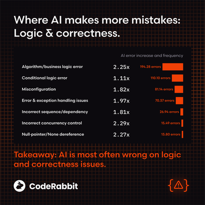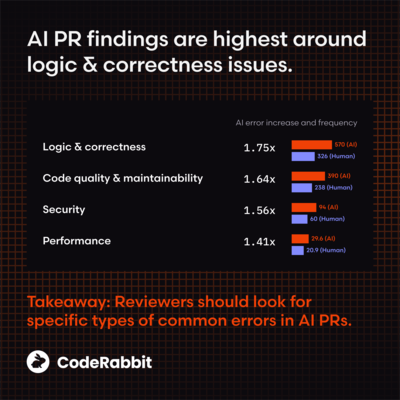 Исследователи из компании CodeRabbit проанализировали 470 pull-запросов (350 - созданные AI, 150 - написанные вручную) в открытых проектах на GitHub и пришли к выводу, что в изменениях, сгенерированных AI-ассистентами, присутствует в 1.7 раза больше значительных дефектов и в 1.4 раза больше критических проблем, чем во вручную написанном коде. В среднем в сгенерированных через AI pull-запросах присутствовало 10.83 проблем, в то время как в созданных вручную изменениях данный показатель составил 6.45.