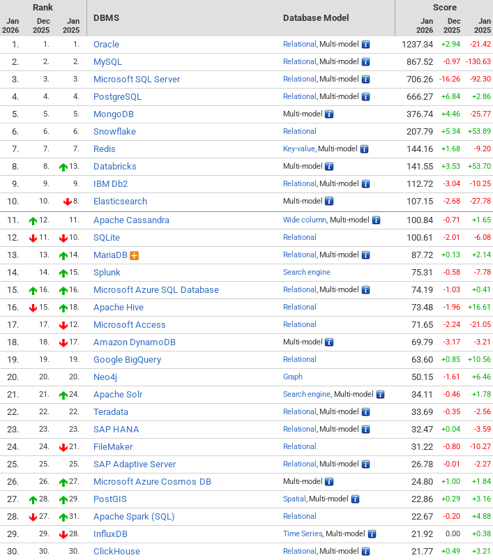 Как и год назад первые пять мест продолжают занимать Oracle, MySQL, Microsoft SQL Server, PostgreSQL и MongoDB. По сравнению с январём 2025 года в десятке лидеров произошли две перестановки: Elasticsearch спустился с 8 на 10 место, а Databricks поднялся с 13 на 8 место. Остальные лидеры сохранили свои позиции в рейтинге, но снижение популярности наблюдается для MySQL (-130 баллов), MS SQL Server (-92), Elasticsearch (-27), MongoDB (-25), Oracle (-21), DB2 (-10), Redis (-9). Рост популярности фиксируется для Snowflake (+53), Databricks (+53) и PostgreSQL (+3).
