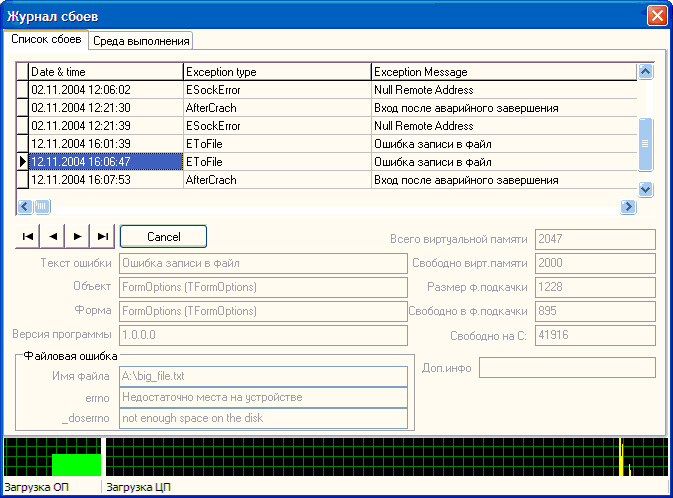 В момент возникновения исключений делается "снимок состояния" системы, который также регистрируется в лог-файле вместе с событием. Лог-файл имеет структуру ini-файла и имя, сформированное по имени приложения. Образец прилагается.