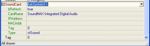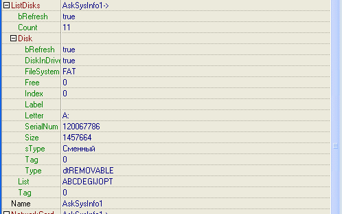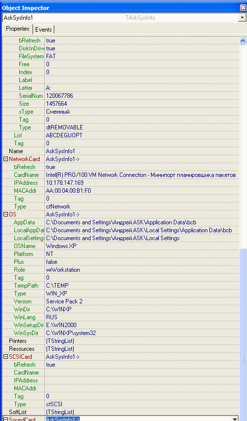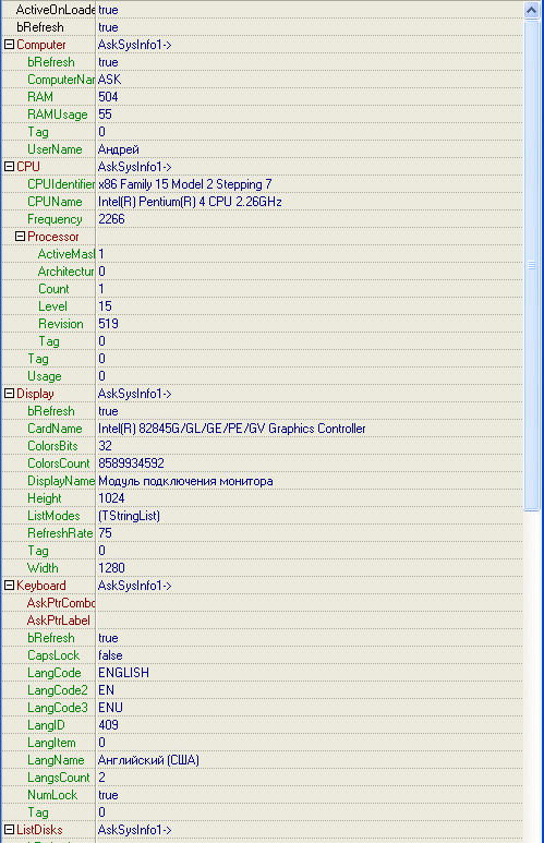 Ну, и на сладкое – компонент TAskSysInfo, являющийся контейнером компонентов: TAskOS * OS, TAskCPU * CPU, TAskListDisks * ListDisks, TAskComputer * Computer, TAskKeyboard * Keyboard, TAskDisplay * Display, TAskCard * NetworkCard, TAskCard * SoundCard, TAskCard * SCSICard.